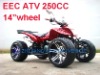250CC EEC ATV (WATER COOLED 4-STROKE QUAD) ECtype-approvalnumber:e4*2002/24*2122 Type:XS-D055 Specificationoffrontwheel:270/30-14 Specificationofrearwheel:270/30-14 Maxspeed:60Km/h N.W/G.W:165/185Kg Typeofengine:Single-cylinder,4stroke250CCWatercooled Fuel:90#-97#gasoline Ratedpowerandrotatespeed:11KW(8500+/-5%r/min) Maxtorqueandrotatespeed:17N.M(7500+/-5%r/min) Compressingratio:9.2:1 Brakemode:Front/reardisc Maxloading:200Kg Climbingability:>16degree Dimension:1710*970*730mm Startingsystem:Electricstart 20'container:17Units 40GPcontainer:42Units 40HQcontainer:42Units Transmissionsystem:Chain Vehicledimension:1900*1230*1030mm Seatheight:740mm Front/rearwheeltrack:945/745mm Minimumgroundclearance:190mm Wheelbase:1370mm Exhaust pipe: double, stainless steel Brake: hydraulic disc both before and after Aluminum hub: aluminum Instruments: Three instruments Tailstock: configuration luxury Tailstock Tanks: iron tank Engine: super-power