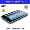 Descriptions of Hot 7" Tablet PC Dimensions(HWD): 190.5×118.5×14.7mm Weight: 332g CPU Processor Speed: 600MHz/500 MHz DSP Memory/ROM: 2 GB Memory/RAM: 128MB+ Memory Slot: T-flash Camera: 30W to 130W Pixels digital camera Color Display: 7 inch TFT LCD with Resistance Touch Screen Resolution: 800×480 Battery Type: rechargeable Polymer battery. Battery0 Capacity: 3000mAh USB: Yes, Mini USB 2. Speaker: Yes G Sensor: Yes I/O Ports: Mini USB 2.0, T-flash, 3.5mm headphone, In-built microphone. Wireless Network: WiFi 80211b/g Software: OS Android 1.5 Browser: Google Browser Video: MKV(H.264 HP), AVI, RM, RMVB, FLV,MPEG-1, MPEG-2 Music: MP3, WMA, APE, FLAC, AAC, AC3,WAV Photo: JPEG, BMP, GIF, PNG, TIFF E-mail: G-mail Google Map Language: English/Chinese/French/Spanish/Portuguese/Italian/German/Indonesian/Vietnamese/Poland /Turkic/Russian/ Greek/ Malay/Swedish