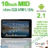 Newest---10 InchInfotm X220 ARM11,1GHz Android 2.1 OSWith RJ45 Ethernet MID Specification: Model No: G10-IX CPU: Infotm X220 ARM11,1GHz OS: Android 2.1 Display: 10.0 Inch LCD Resistive Touchscreen,1024*600 Pixels Memory: 256MB NandFlash: 2GB built-in, can extended upto 32GB by TF Card or Micro SD Camera: 1.3M Camera GPS: Built-in GPS (but does not currently support this feature, is still testing, waiting for the firmware update.) HDMI: Support HDMI,1080P RJ45 Ethernet: 10/100M 3G: USB 3G Dongle Wireless: WI-FI (802.11 a/b/g)Communication: FACEBOOK,IREAD etc. Sensors: 3 Direction G-sensor Sound System: Built-in Speaker Audio Player: MP3, WMA. FLAC, AAC, AC3, OGG, WAV Video Player: MKV (H.264 HP)/RMVB/MPEG-4/FLV 720p (Supports all format) Battery Time: WIFI ON: 4 hours ; WIFI OFF: 6Hours Language: Support Multi-Language Accessory: 1 x 10.0 Inch Android Tablet PC 1 X Power adapter 1 X USB Cable 1 X User Manual Product Size: 270 X 170 X 15 MM, 450G Package Size: 300 x 200 x 90 MM, 1.3KGPicture Details: