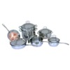 12 piece copper bottom cookware set 1.5QT.(16cm) covered saucepan 2.5QT.(18cm) covered saucepan 4QT.(22cm) covered casserole 8QT.(24cm) covered stockpot pasta insert for 8QT. 8"(20cm) open frypan 10"(24cm) covered skillet (cast handle) 2 sets/ctn: 64*33*6.5cm