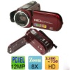 Digital Video Camera Max Resolution12.0 Megapixel(Interpolation)Image Sensor5.0 Megapixel CMOSCapacitySupport SD Card(max 32GB, not included in the accessoriesImage Resolution4000x3000 (12.0 Megapixel)3264x2448 (8.0 Megapixel)2592x1944 (5.0 Megapixel)2048x1537 (3.0 Megapixel)1600x1200 (2.0 Megapixel)Video RecordingHD: 1280x720, 20fpsVGA: 640x480; QVGA: 320x240fpsVideo ShootingYESAudio RecordjingYESDigital Zoom8xFile FormatsJPEG/AVI/WAVLCD Viewfinder2.7" TFT LCD Screen(90 degree rotate)ExposureAuto or EV +2.0 -2.0White BalanceAutomatic/Daylight/Tungsten/Fluorescent/CloudyFlash LightAuto/On/OffSpeakerYESColorNormal/Sepia/B&WShooting ModeSingle shot/Self-time shot/Multi-shotSelf-Timer5/10 seconds DelayPortUSB2.0/TV OUTLensFixed f=7.23mm, F=2.8Focus Range20cm-35cm(Macro)/1.5m-∞(Normal)Shutter SpeedElectronic, 1/4-1/1000 secondOSD LanguageEnglish etc.Power4x AAA Battery(not included)Automatic Power60s/120s/Always OnSize124x65x55 mmSystem RequiredWindows, Mac OSX and aboveAccessoriesUSB & TV Cable, DV Bag, CD Driver, Manual Good item for camera market & gift market!