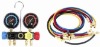 4-valve diaphragm valve anodized aluminum manifolds gauge set; 36",60" or 72" 4-pack colored hoses with 5/16"SAE fittings; with in-line ball valve 10cm far away 45 degree coupler; Gases are provided on request; Each set is packed into color box with our brand or neutral white box packing without any english words;