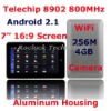 7 inch screen Android 2.1 with WiFi and Aluminum CoverModel Number:TPC-00704-2Display:7 inch 16:9 Touch Screen, 800x480 PixelOperate System:Google Android 2.1CPU:Telechips 8902 800MHzMemory / Nand Flash:256M / 4GBExtended Memory:TF Card, can up to 32GBNetwork:WiFiG Senser:SupportCamera:0.3M Camera (Front)Speaker:Built in speaker 2x0.5WMicrophone:yesIn / Out:2x USB 2.0 Ports , 1x 3.5mm stereo headphone jack, 1 DC-in jack, 1x TF card slotHDMI HD Output:NoBattery:2600mAhDimension:195 x 115 x 14mmWeight:0.95kg/Full SetAccessories:1 Screen Protection film 1 mini-usb-cable 1 OTG cable 1 manual(English) 1 charger: AC adapter AC100-240V 50-60Hz9V 1 earphoneSoftware:Audio:MP3,WMA,APE,FLAC,OGG,WAVVideo::AVI, MKV(XVID/px/H.264), MOV,TS, M2TS, RM/RMVB, FLV,WMV, 3GP, MPEG, DAT, MP4Image:JPEG, BMP, GIF, PNG, TIFFOffice:support word ,Excel, Power point , PDF and email function BrowserGoogle Browser Google MapSupport google map Language:Support Worldwide Languages