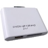 Camera Connection Kit for iPad. The kit includes two connectors, each with a different interface: 1) The Camera Connector features a USB interface. Just plug it into the dock connector port on your iPad, then attach your digital camera or iPhone using a USB cable (not included). 2) Use the SD Card Reader to import photos directly from your camera's SD card. Connect it to your iPad, then insert your digital camera's SD card into the slot. 3) After you make the connection, your iPad automatically opens the Photos app, which lets you choose which pictures to import, then organizes the selected photos into albums. When you sync iPad to your PC or Mac, the photos on your iPad are added to your computer's photo library. 4) iPad and the Camera Connection Kit support standard photo formats, including JPEG and RAW. Camera Connector; SD Card Reader.