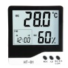 HT-01Mini temperature and humidity thermometer: Features: 1.Indoorrelativehumidityandcomfortlevelindicator 2.Clockdisplaywithalarmfunction 3.SelectableCorFdisplaybypressC/Fkey Specifications Measuringtemperaturerange: -50°Cto70°C(-58°F.to158°F.) Temperatureaccuracy +1°C(+2°F.) Temperaturedisplayresolution 0.1°C(0.2°F) Humidityaccuracy +5% Humiditydisplayresolution 1% Samplingperiod 10S Size(HxWxD):106mmX98.5mmX21.5mm(HT-01) Weight: Accessories:AAA1.5v*1
