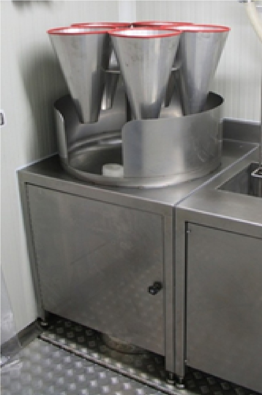 2)Lethal chamber with the receiving table to stun, chalice of blood collection and four cones to ensure a fixed carcasses and drain the blood into a special tank located inside the table under the bowl of blood collection.