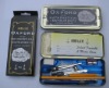 oxford math set 14pcs including 1 compasses, 1 divider, 4pcs ruler set,2 stencils, 1 long pencil, 1 short pencil, 1 sharpener, 1 eraser, 1 paper card, it can be in different pcs such as 9pcs,10 pcs,11 pcs,12 pcs OEM logo acceptable Oem services are welcome 1 compass 1 divider 1 15cm ruler 1 45-45-90 degree set square 1 30-60-90 degree set square 1 180degree protractor 1 3.5inch short pencil 1 eraser and 1 square pencil sharpener 1 PEN tin box packing paper cover