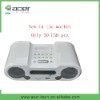 Radio Alarm Clock Speaker System RA007MODEL NO. 007Product FeaturePortable Square Speaker System for iPod Time display,clock set-up function; Set up time to power off automatically; Ipod interface input,key-press control function. ZOOM in AUX external input. Mp3 play (MMC/SD card,USB). Long distance remote control function CE and FCC certified Product Specification -Power Supply: DC 12V 2A - Distortion (1KHz, 1W): 1% - S/N Ratio: 85dB - Frequency Response: 20Hz 20KHz - Power Consumption: 4+4(W) -Product size:270*150*90(MM) Accessories -power adapter -Remote control (Battery included) -Line input audio cable -Instruction Manual Packing list: Product Size:280x145x90mm Box size:305x210x95mm Outer Box size:410x325x450mm Net Weight :165kg Gross Weight:1560kg A box of 8pcs Total Weight:13.5kg 20GP container/3336pcs; 40GP container/7200pcs; 40HQ container/9064pcs