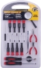 Carbon Steel Contents: 8 - Precision Screwdrivers: Slotted: 2, 2.5mm; Phillips: #00, #0; Star: T8, T10, T15, T20 1 - Pickup Tool 1 - Telescopic Inspection Mirror 1 - Double-End Hook 1 - 3" Long Nose Pliers 1 - 3" Diagonal Pliers 1 - Magnify Glass 1 - Nipper
