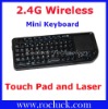2.4G Mini Wireless Keyboard with Touchpad Features: * 2.4G wireless receiver integrated design * Touchpad 90-degree flip * Innovative design of the Navigation keys * Windows Multimedia Control * Built-in rechargeable lithium-ion battery * Laserpointer with remote control * With a real notebook Touchpad * Real QWERT full-function mini keyboard * Portable, elegant, lifestyle Specifications: * Max Operating distance: 30m * Model: DSSS model RF * Transmitting power: Max +4dBm * Working voltage: 3.3V * Working current: <150mA * Charge voltage: 4.2V 5.05V * Charge current: <350mA * Sleep current: <1mA * Dimension: 151*59*12.5mm * Net Weight: 200g * Color: black, white ,Black/silver optional System Supported: * Windows 2000, XP, Vista ,windows CE,windows 7 * Linux (Debian-3.1, Redhat-9.0 Ubuntu-8.10 Fedora-7.0 tested)