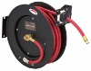 50Ft.Ratractable Air/Water Hose Reel with 3/8"Hose Spring-driven automatic rewind neatly coils hose when not in use. Hose can be used with air or water. Locking ratchet keeps hose at desired length when in use Heavy gauge steel reel Holds 50 ft. of 3/8" hose (included) 2-1/2" hose stop Powder-coat finish Full-flow solid brass swivel joint Multi-position release ratchet and spring fully enclosed and lubricated Four direction non-snag rollers reduce hose wear