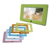 Highlight: Interchangeable Panel ( price included 4 color panel ) Solution: Cheertek Screen: 7 inch 16:9 TFT LCD,480*234 RGB ,Bright: 200/m2 Contrast: 250:1 Photo: Support JPG, Slide Show, play in thumbnail mode Memory Card: SD, MMC, MS, USB Host Calendar: Calendar / Clock / Alarm AV In/Out: support AV out Operation: Remote Controller and 7 Main function buttons OSD language: English, Germany, French, Spanish, Russian Music: support Mp3, WMA audio Movie: MPEG1, MPEG2, MPEG4, AVI ( can be made to autorun movie after power on ) Audio Output: build with stereo speakers File Edit: Mutual Copy between USB and Card, Support File Delete Power Supply: 5V DC