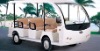 8passengers. 5KW(5.5HP) DC motor 4 speeds forward, 1 speed reverse 145/80-R12 automotive tires 4 wheel hydraulic brake, parking brake 275 amp Curtis programmable controller with regenerative braking. Two side view mirrors Automotive windshield Amp meter, voltmeter, speedometer, odometer Battery meter Radio and CD player with 2 speakers Head lights, LED Taillights, Brake lights, Turn signals, Fog Lights, Emergency lights switch, Horn, Reverse alarm. 48V TO 12V Voltage reducer for all accessories. 2 Onboard battery charger 25 mph maximum speed Steel wheels Size: 154"X56"X77". Options: 2-point seat belts, 2 per row Enclosure