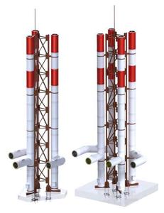 Chimneys for industrial boilers and boiler houses. Self-supporting structure on the bearing tower and wall. The diameter of the flues from 150 to 800 mm. Internal and external shell made of stainless steel AISI-304. Tubes one, two, three or four of the flue. The height of the mast pipe 11. 5 to 28. 5 m height self-supporting pipes from 6 to 45 m. Used for flue gas temperatures up to +500 gr. C. delivery of chimneys throughout Russia. The minimum price for flue pipe. Units are also available separately insulated and non-insulated pipelines. By order of the pipe are equipped with ladders, viewing platforms, lighting fencing and marking color. Chimneys are certified. To order the chimney needs to know the height of the pipe, the internal diameter of the duct, and preferably the brand of boiler used. Call us, our experts will consult you and will calculate the chimney.