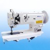 This machine is a high-speed single needle medium-heavy lockstitch sewing machine that utilizes a link-drive take-up thread and rotating hook. It also uses a plate stitch regulator, a lever reverse mechanism and has auto- lubrication.