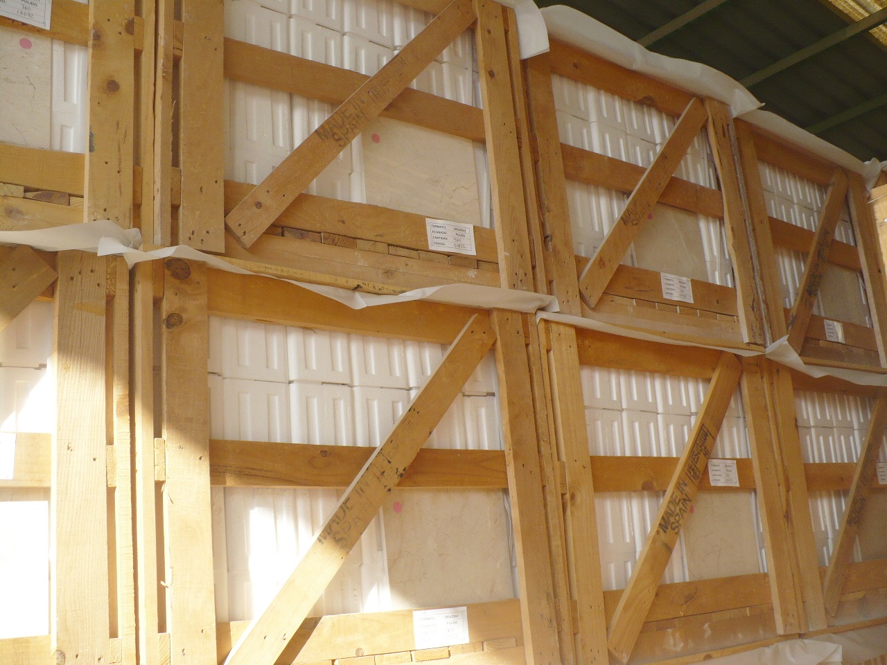 Material packed in polystyrene boxes into export wooden crates. 360 pieces per crate. Also availability of small crates of 240 pieces each